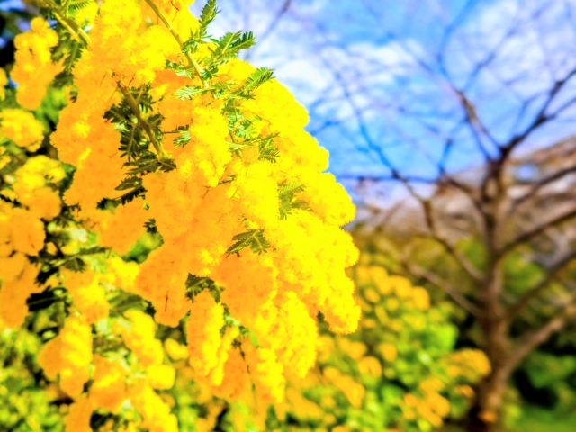 ミモザの黄色が青空によく映えていますね。